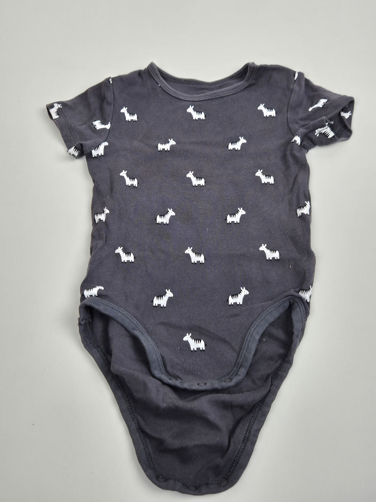 Kojenecké body H&M v tmavší antracitově šedé barvě s jemným bílým potiskem zebřiček. Měkká bavlna je příjemná na nošení po celý den, krátké rukávy jsou ideální do teplejších dnů nebo jako spodní vrstva. Praktické zapínání mezi nožičkami usnadní přebalování.