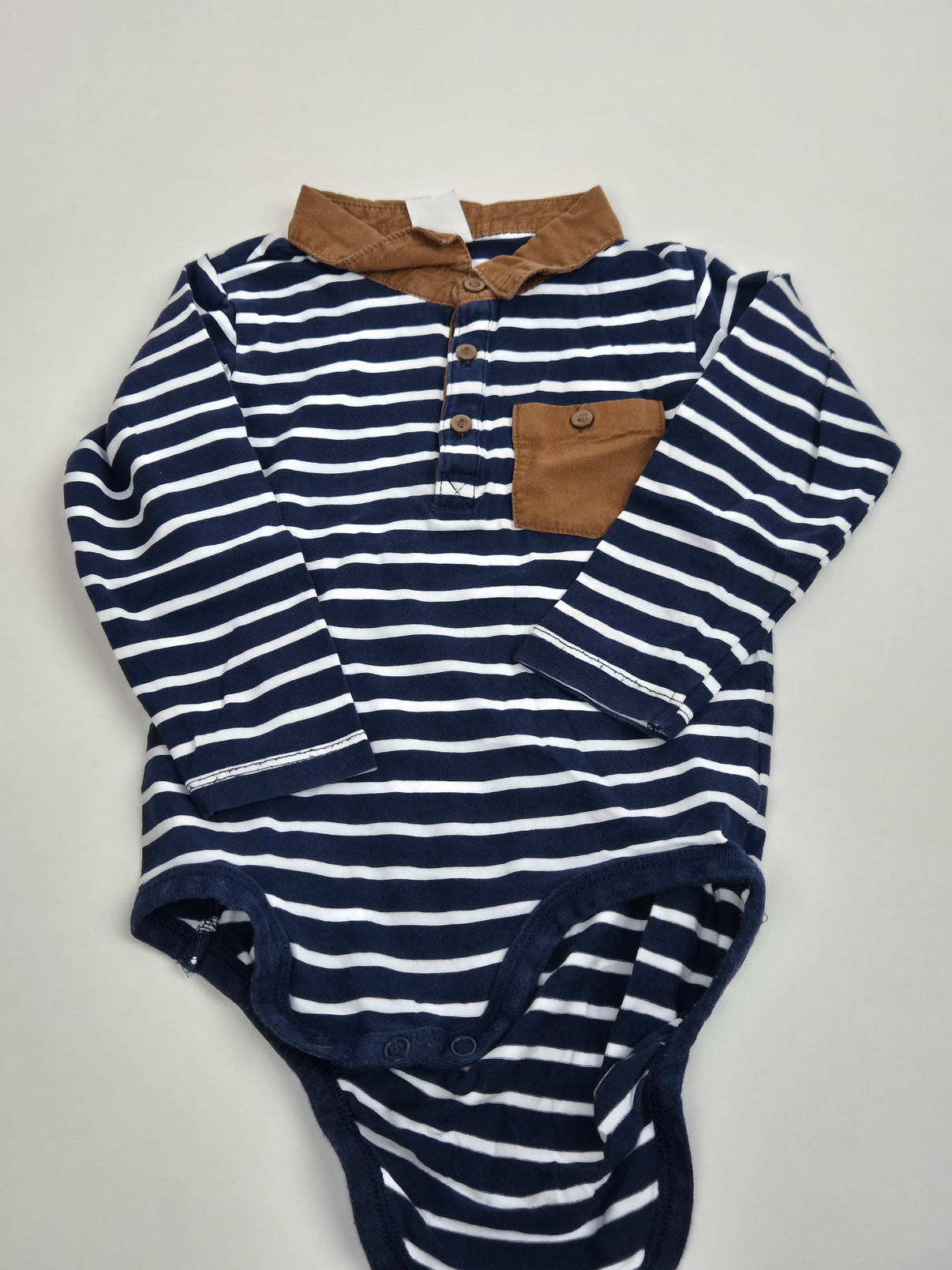 Stylové bavlněné body v námořnické kombinaci tmavě modré a bílé barvy s pravidelnými proužky. Hnědý kontrastní límeček a náprsní kapsička s knoflíčkem dodávají body elegantnější, „košilový“ vzhled, díky kterému se hodí i na slavnostnější příležitosti. Měkký a příjemný materiál zajistí pohodlí po celý den, zapínání na patentky mezi nožičkami usnadní přebalování.