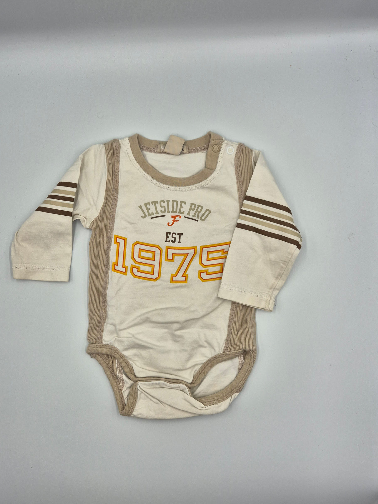 Na přední straně je výrazný sportovní potisk „Jetside Pro Est 1975“ v kombinaci hnědé a hořčicově žluté, který body dodává lehce retro a univerzitní nádech. Pruhy na rukávech podtrhují sportovní styl. Praktické druky na rameni i mezi nožičkami usnadní oblékání i přebalování.
