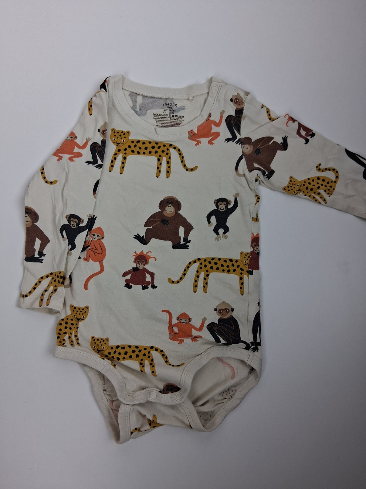 Veselé body s dlouhým rukávem značky Lindex ve velikosti 86 s motivem džungle – najdeš na něm opičky, gepardy i další zvířátka v pestrých barvách na smetanovém podkladu. Vyrobené z měkké a kvalitní bavlny, která je příjemná k dětské pokožce. Zapínání na rameni a mezi nožičkami pro snadné oblékání i přebalování. Ideální kousek na každodenní nošení pro malé objevitele – vhodné pro holčičky i kluky.