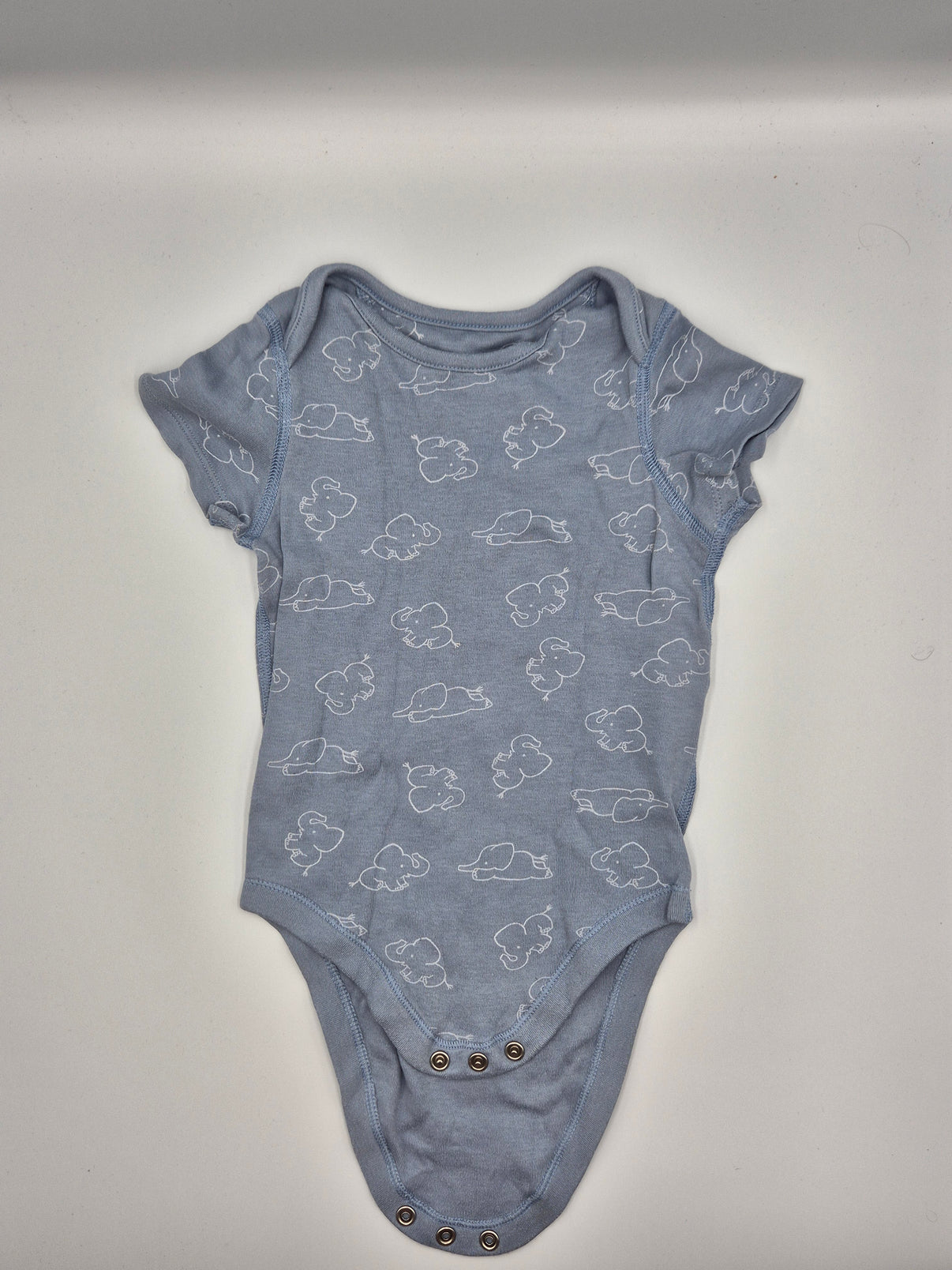 Celé body zdobí drobný bílý potisk sloníků, který dodává hravý, ale stále decentní vzhled. Krátký rukáv je ideální na teplejší dny nebo jako spodní vrstva pod mikinu či svetřík. Praktické zapínání mezi nožičkami usnadní přebalování i rychlé oblékání.