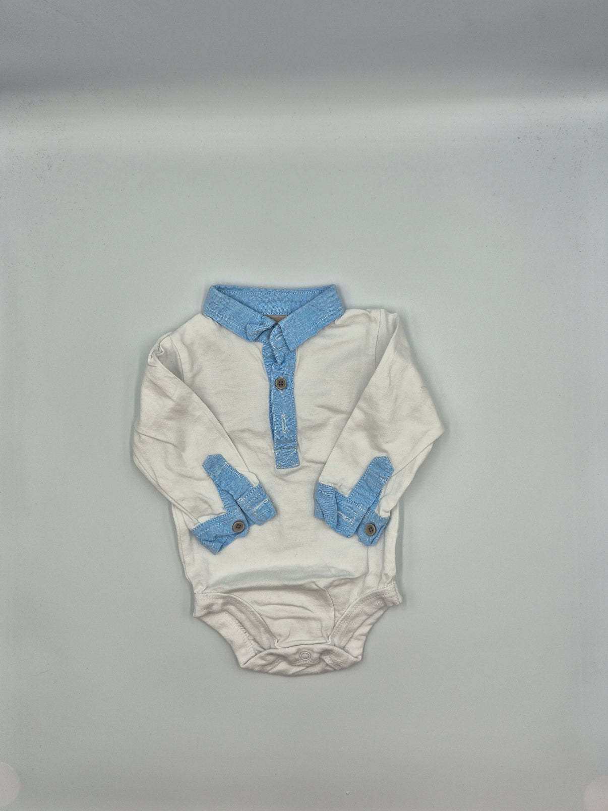 Základ tvoří jemná smetanově bílá barva, kterou doplňují světle modré detaily ve stylu košilového límečku, knoflíkové légy a manžet. Modrá má lehce denimový nádech, díky čemuž působí outfit velmi stylově, ale stále pohodlně. Hnědé knoflíčky dodávají příjemný kontrast a podtrhují celkový „malý gentleman“ vzhled.