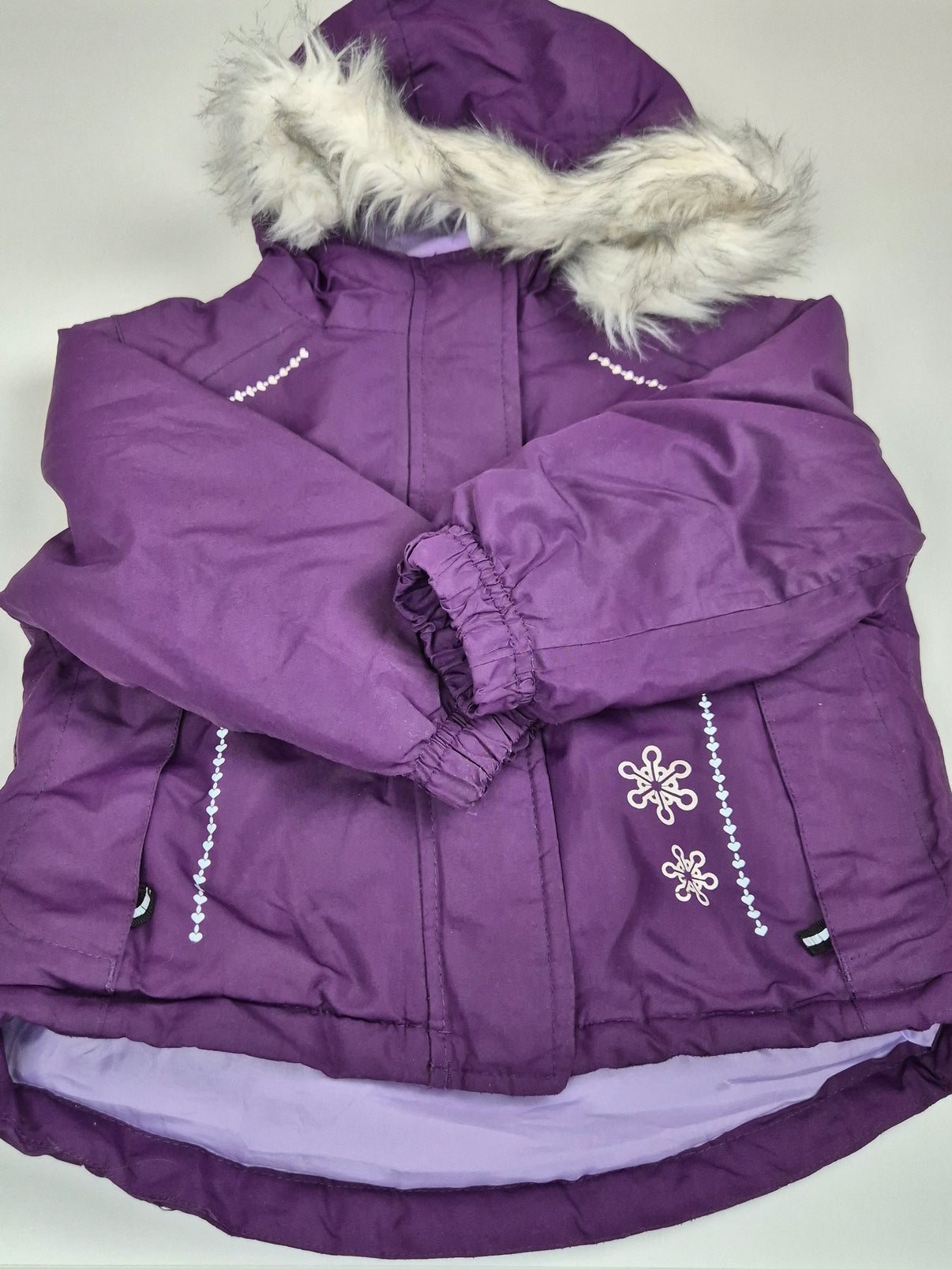 Teploučká zimní bunda Lupilu ve výrazné fialové barvě, ideální do skutečně studených dnů. Uvnitř je podšitá měkkým fleecem a má praktický sněhový pás, takže výborně drží teplo při venkovních hrách i zimních radovánkách. Kapuce je zdobená hebkou kožušinkou a celkový vzhled doplňují jemné zimní motivy na přední straně i na zádech. Rukávy mají pružné gumičky, aby nefoukal vítr dovnitř, a bunda je tak skvělou volbou pro zimní období. Určeno pro holčičku.