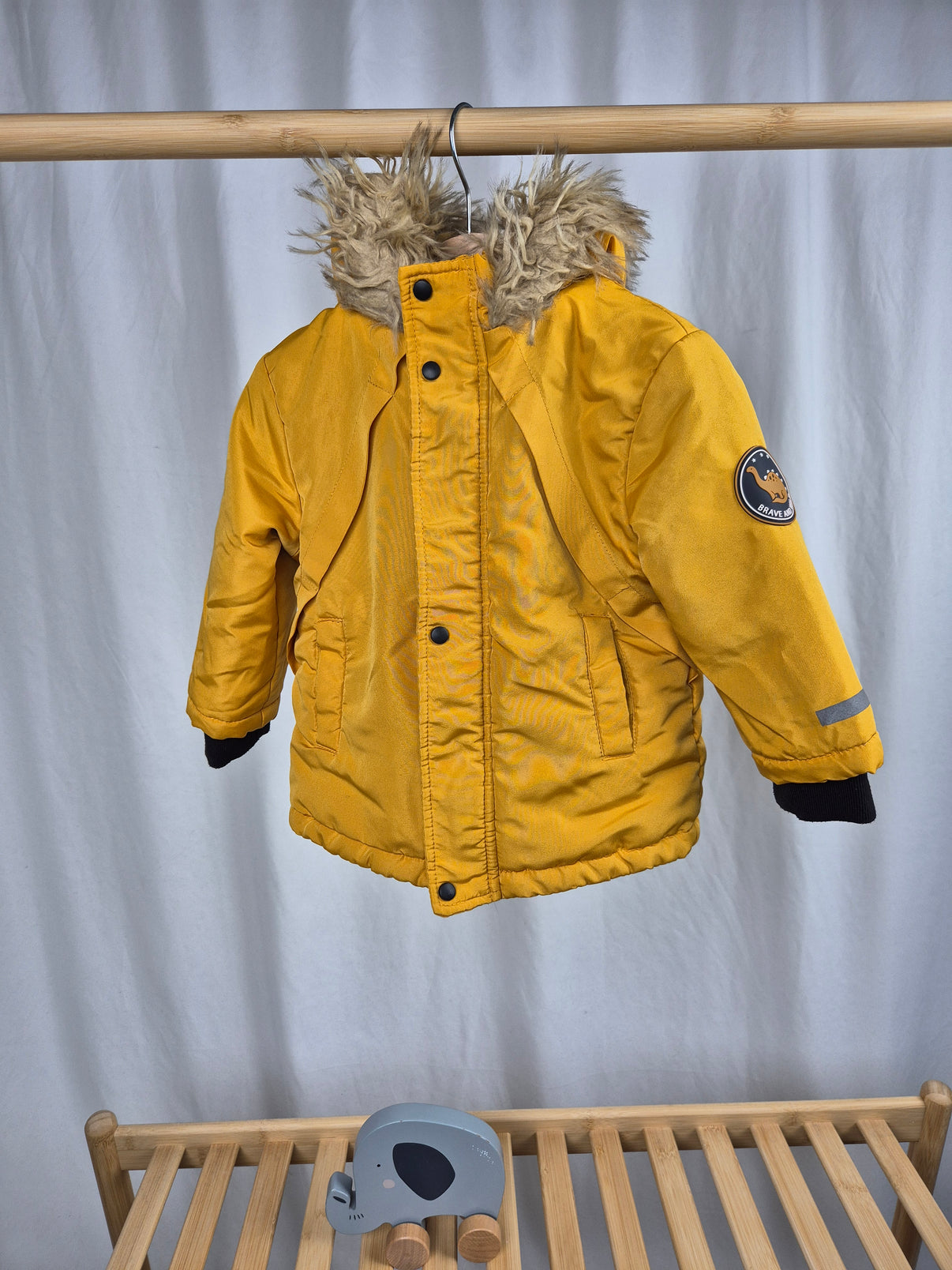 Hořčicově žlutá zimní bunda Sinsay s kapucí a hebkým kožíškem zahřeje každého malého dobrodruha i ve velké zimě. Vnitřní strana je příjemně zateplená, rukávy zakončené náplety brání pronikání chladu. Bunda...