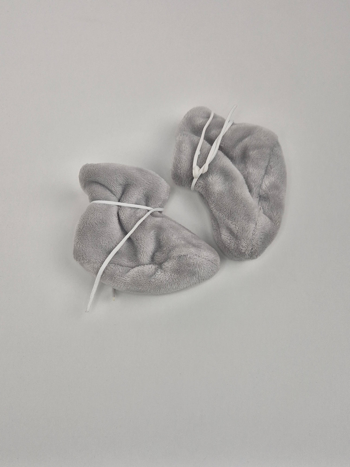 Měkoučké capáčky Esito v jemném světle šedém odstínu, který se snadno kombinuje s jakýmkoli oblečením. Hebký plyšový materiál krásně zahřeje malé nožky a je příjemný i pro citlivou dětskou pokožku. Praktické zavazování pomáhá udržet capáčky na místě, takže jsou ideální do kočárku, nosítka nebo na domácí pohodu.