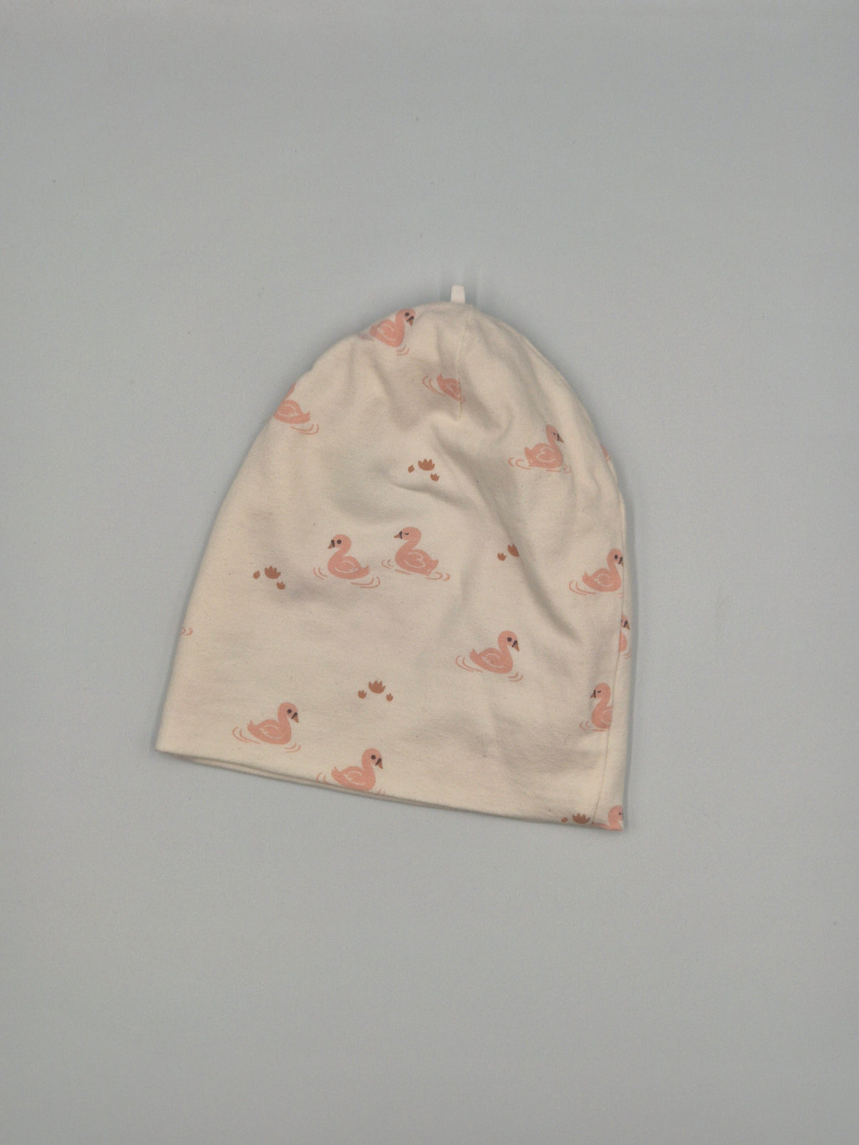 Roztomilá dětská čepička značky Lindex v jemném krémovém odstínu s něžným potiskem labutí v tlumené lososově růžové barvě. Kombinace světlého podkladu a drobných motivů působí velmi čistě a něžně.
