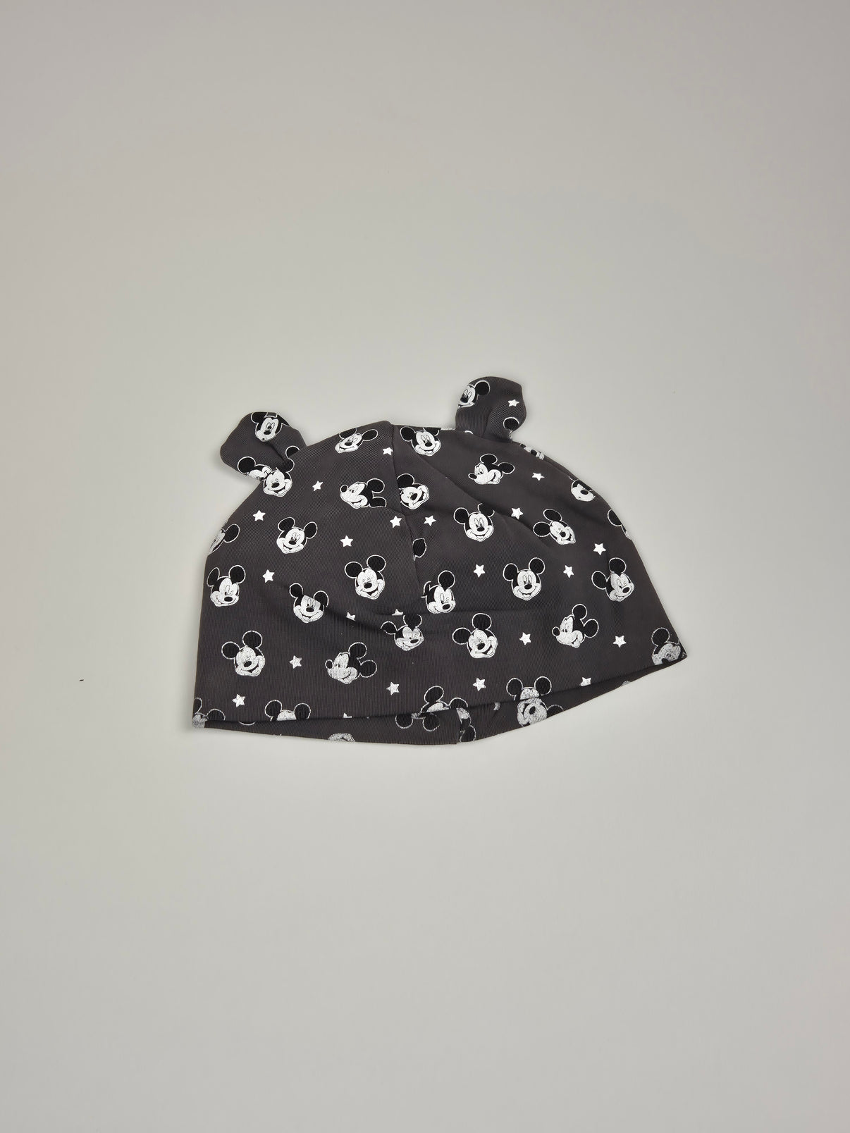 Bavlněná čepice v tmavě šedé barvě s celoplošným potiskem Mickey Mouse a hvězdiček. Roztomilé „ouška“ dodávají čepici hravý vzhled.