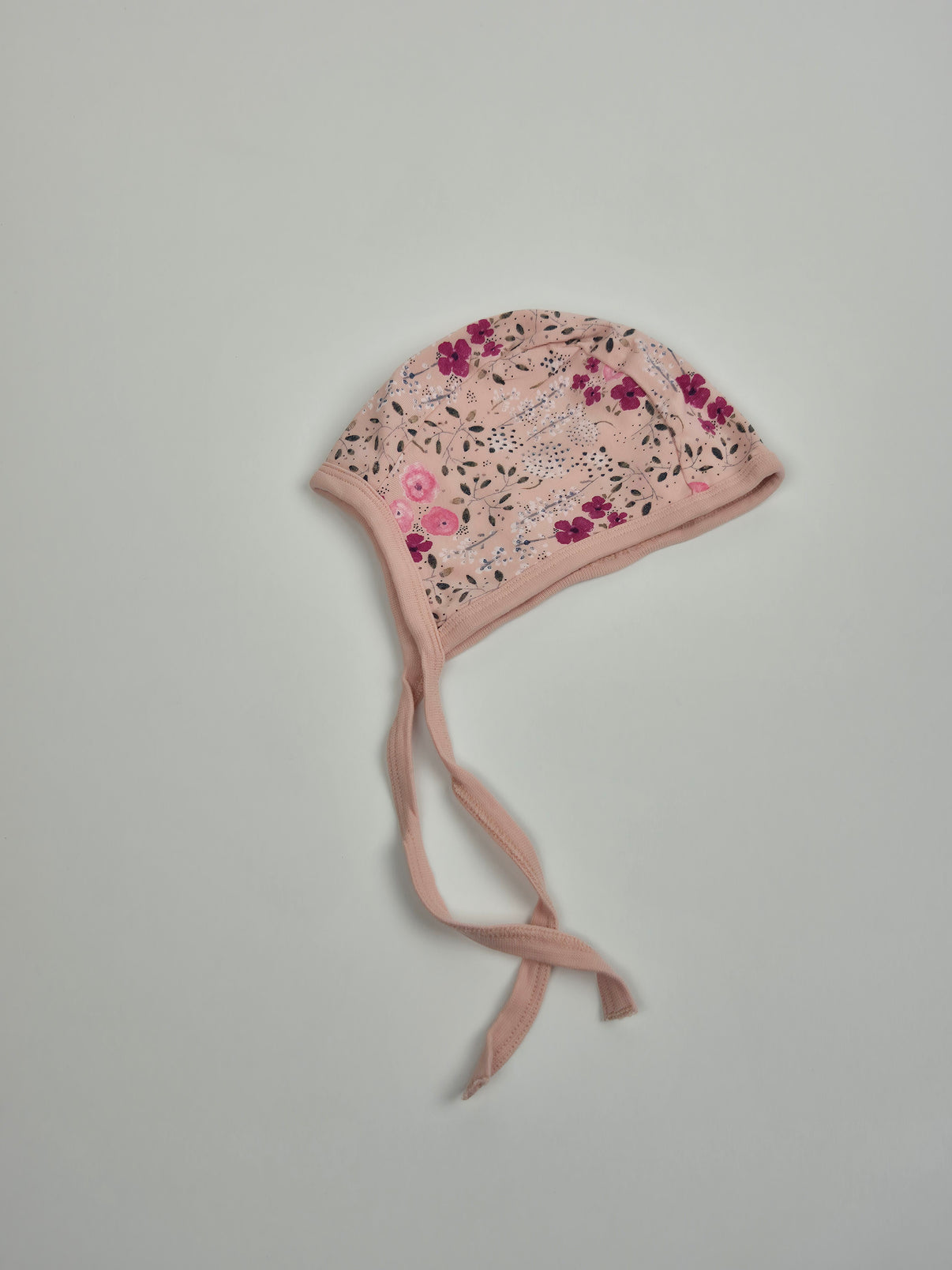 Lehká růžová čepice s jemným květinovým vzorem, vhodná pro holčičky na procházky a do školy. Zavazování pod bradou drží čepici na místě, pohodlná a měkká pro citlivou dětskou pokožku.