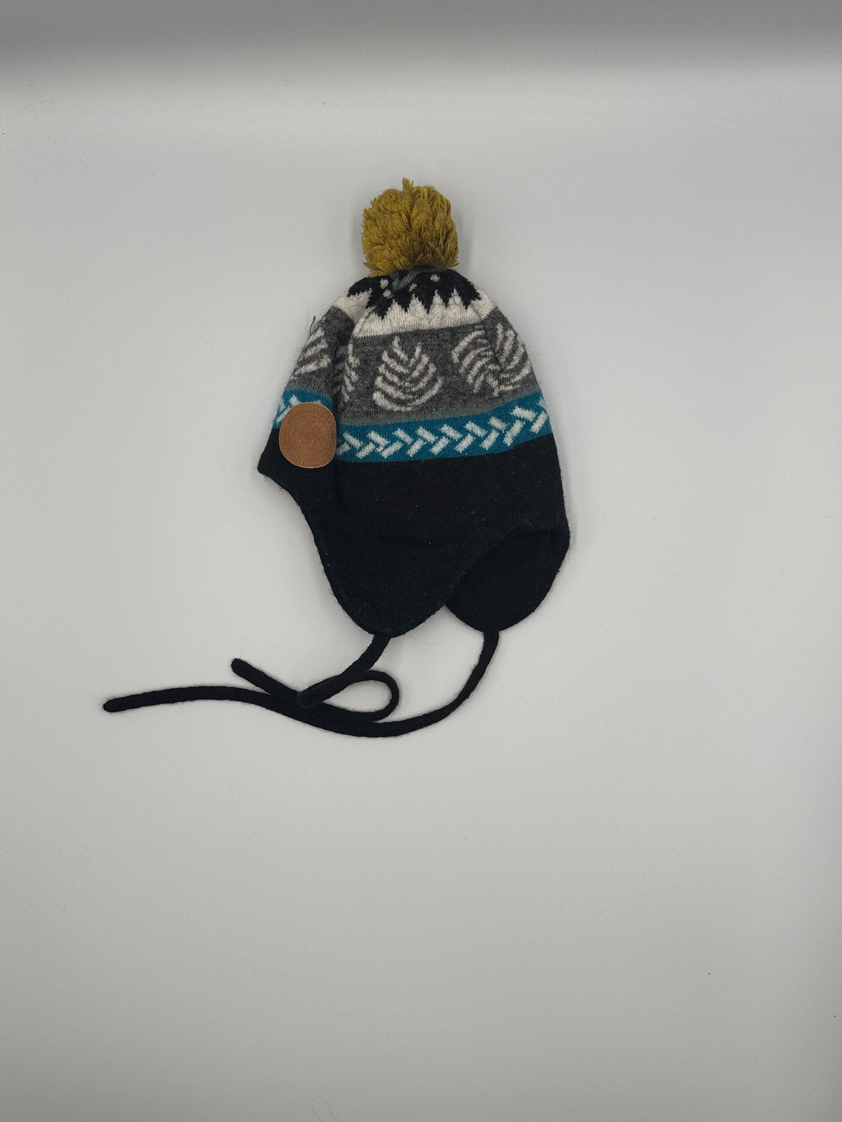 Čepice je v kombinaci tmavě modré, šedé a krémové barvy s výrazným tyrkysovým pruhem, který jí dodává svěží detail. Nechybí ani hořčicově žlutá bambule nahoře, která celý kousek krásně oživuje. Vzor s listy a geometrickými prvky působí hravě, ale zároveň nadčasově.