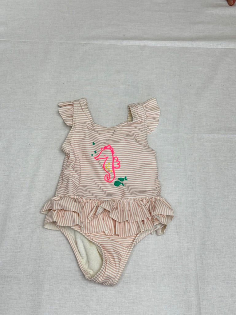 Roztomilé jednodílné plavky s kalhotkovou vložkou od značky Marks & Spencer pro věk 6-9 měsíců. Plavky jsou v jemném růžovo-bílém pruhovaném designu, s potiskem růžového mořského koníka na přední straně. Plavky mají volánky kolem pasu a na ramenou, které přidávají hravý a něžný detail. Plavky obsahují nepropustnou froté kalhotkovou vložku proti případné nehodě. Tyto plavky jsou ideální volbou pro letní koupání nebo dovolenou u vody, kde bude tvoje malá princezna vypadat stylově a zároveň se bude cítit pohodlně.