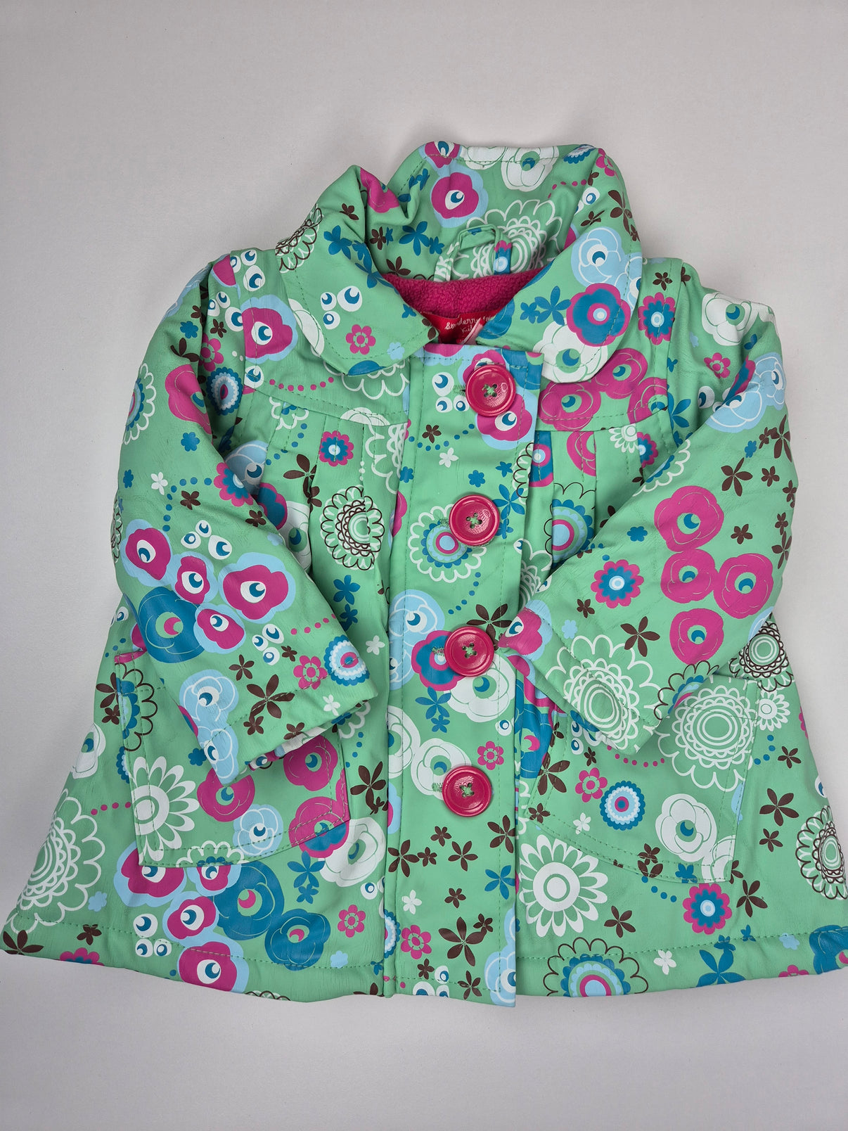 Barevný kabátek v jemném zeleném základu s bohatým květinovým potiskem v růžových, modrých a bílých tónech je nepřehlédnutelný kousek pro nejmenší. Vzor působí hravě a veselě, ideální na jaro či podzim. Kabát má zapínání na výrazné růžové knoflíky a příjemnou podšívku, která dodá potřebné pohodlí a teplo.