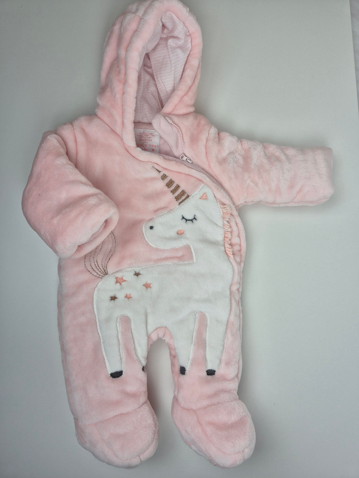 Hřejivá zimní kombinéza F&F v jemném světle růžovém odstínu z hebkého, plyšového materiálu. Na přední straně je roztomilá aplikace jednorožce v bílé barvě s drobnými hvězdičkami, která dodává kombinéze kouzelný a něžný vzhled. Růžová barva působí velmi jemně a je ideální pro miminko.