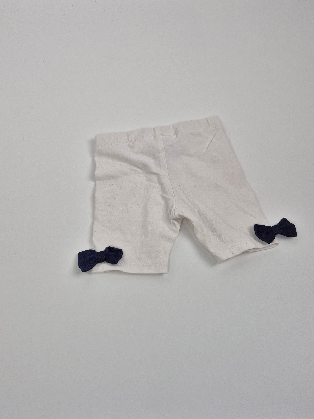 Pohodlné bavlněné kraťasy ve světlém krémově bílém odstínu, který se snadno kombinuje s jakýmkoli topem. Pružný pas zajistí komfort při nošení i dovádění a měkký materiál je příjemný na dětskou pokožku. Roztomilé tmavě modré mašličky na nohavičkách dodávají kraťáskům jemný, hravý detail.