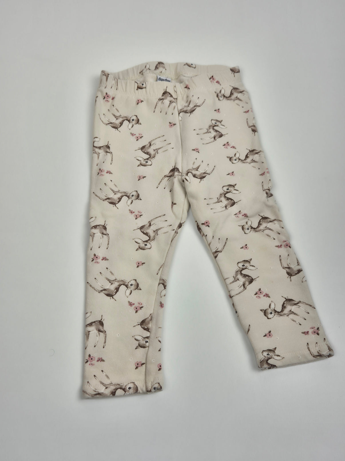 Jemné legíny Dopodopo v krémově béžovém odstínu s něžným celoplošným potiskem srneček a drobných kvítků v tlumených přírodních barvách. Motiv působí klidně, romanticky a krásně ladí s neutrálními i pastelovými kousky.