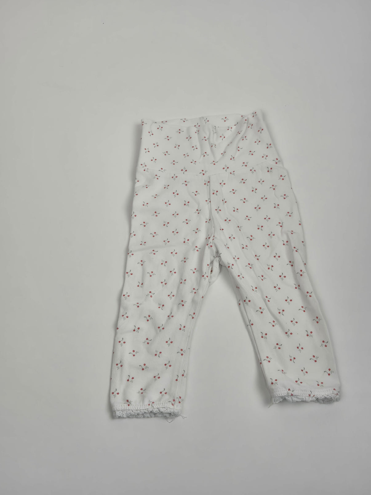 Jemné legíny v čistě bílé barvě s drobným potiskem třešniček v tónech červené a zelené, které působí něžně a hravě zároveň. Vzor je velmi jemný a elegantní, ideální pro miminko.