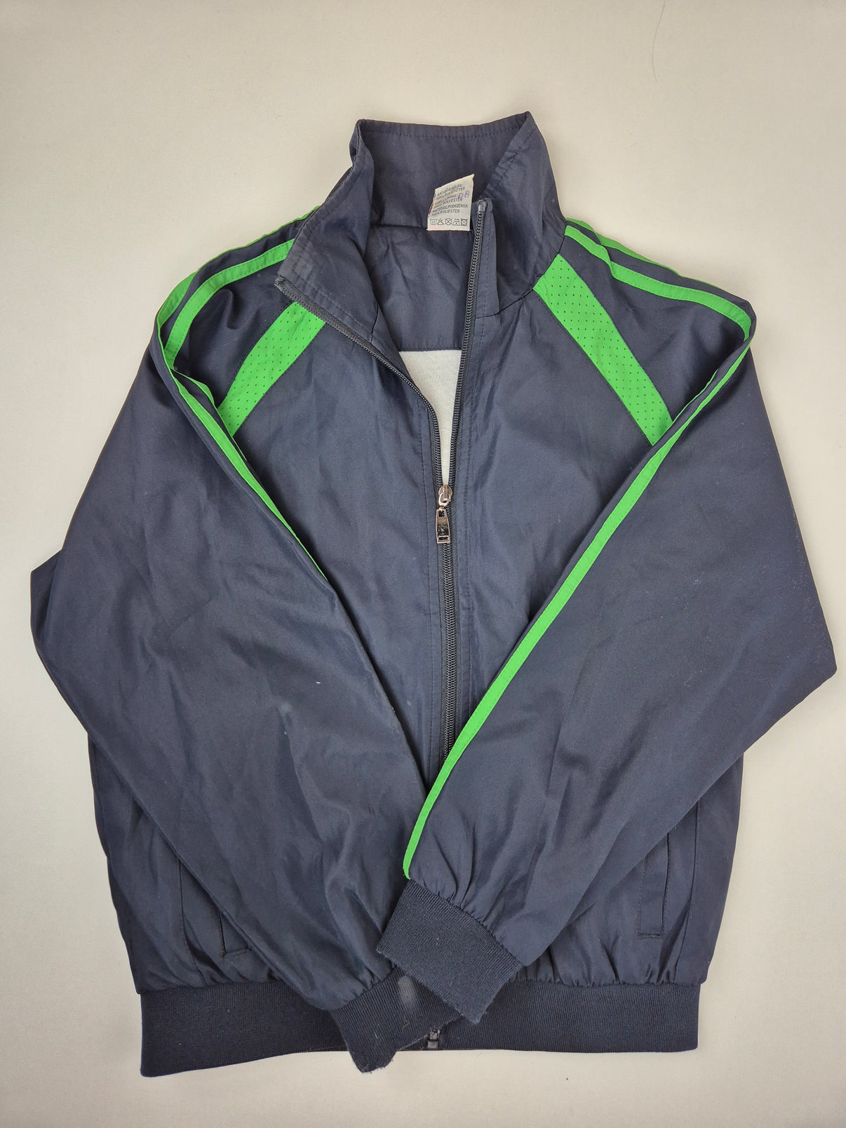 Sportovní lehká bunda Aoles v tmavě modré barvě s výraznými zelenými pruhy na rukávech. Praktický kousek do školy, na hřiště i na sportovní aktivity. Má zapínání na zip, dvě kapsy...