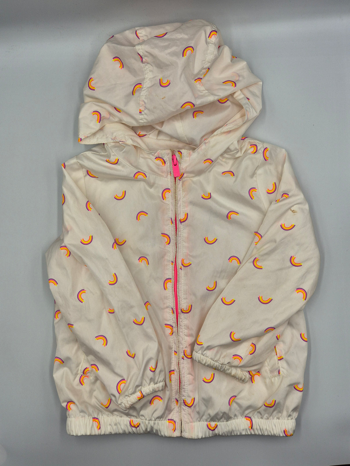 Lehká dětská bunda GAP ve velikosti 104 v jemném smetanovém odstínu s hravým celoplošným potiskem malých duhových obloučků. Základní barva je krémově bílá s teplým podtónem, který krásně doplňují duhy v kombinaci růžové, žluté a oranžové – veselý, ale stále decentní motiv.