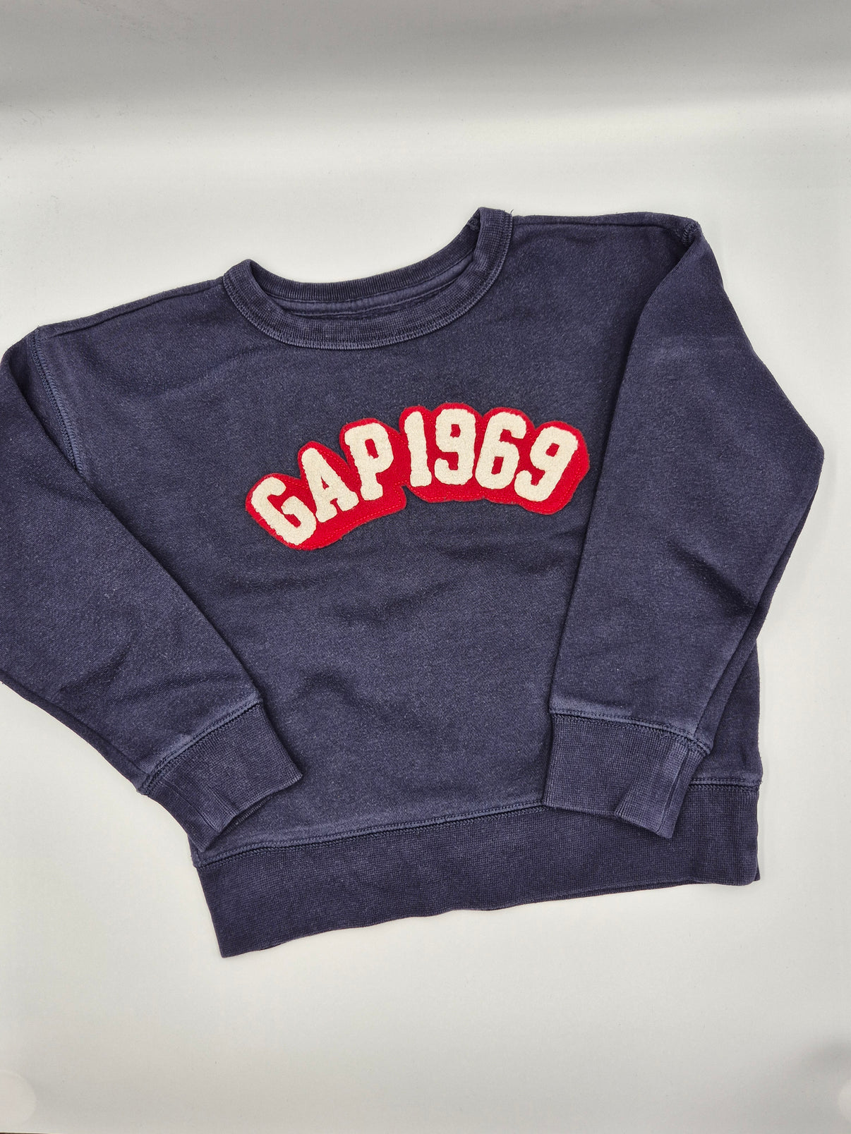 Barva je tlumená tmavě modrofialová – něco mezi inkoustovou modrou a jemnou švestkovou. Díky lehce opranému efektu působí mikina příjemně měkce a má hezký vintage nádech. Dominantou je výrazné logo „GAP 1969“ v kombinaci krémově bílé a červené, které krásně kontrastuje s tmavým podkladem.