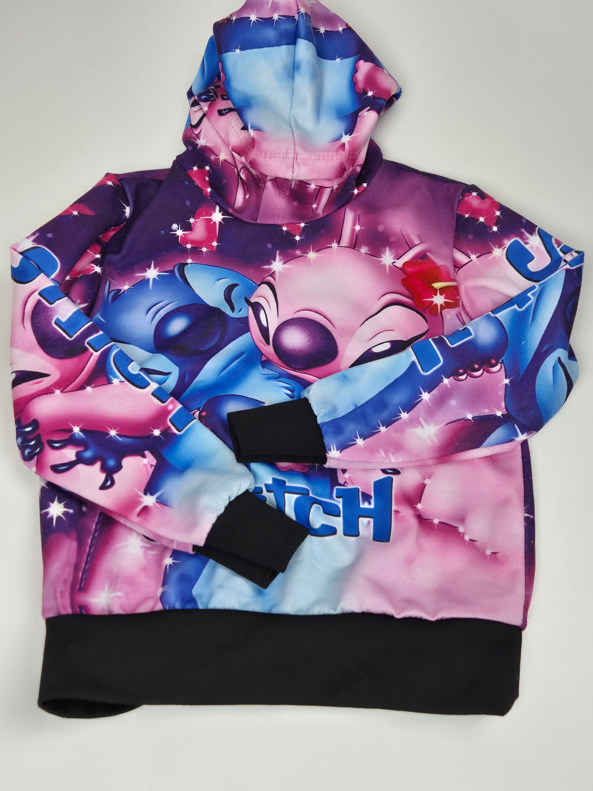 Barevná, hravá mikina s kapucí s motivem Stitch & Angel potěší každého malého fanouška pohádek. Kombinace růžové, modré a fialové působí veselé a výrazné, ideální na školku, hřiště i domácí pohodu. Příjemný pružný náplet na rukávech i spodním lemu zajišťuje pohodlné nošení a drží tvar. Hodí se spíše pro holčičky, ale klidně i pro všechny děti, které mají Stitch rád.