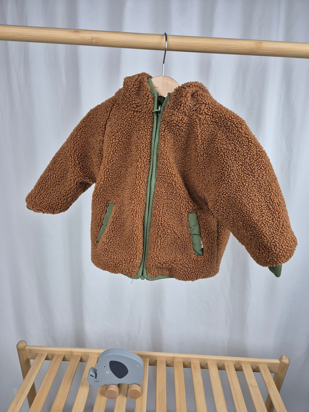 Měkoučká oboustranná bunda Ergee v hřejivé kombinaci světle hnědé „medové“ barvy a olivově zelené podšívky. Jedna strana je z hebkého chlupatého beránka, druhá z hladkého šusťákového materiálu – ideální pro proměnlivé počasí. Bunda má praktický zip po celé délce a dvě kapsy na drobnosti.
