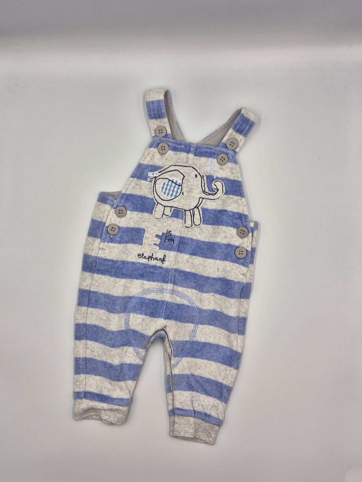 Overal zdobí milá aplikace slona na hrudníku s drobným nápisem, která dodává kousku veselý dětský vzhled. Praktické zapínání na knoflíčky na laclech i po stranách usnadňuje oblékání a umožňuje pohodlné oblékání přes body nebo tričko. Spodní část má patentky mezi nožičkami, takže přebalování je rychlé a jednoduché.