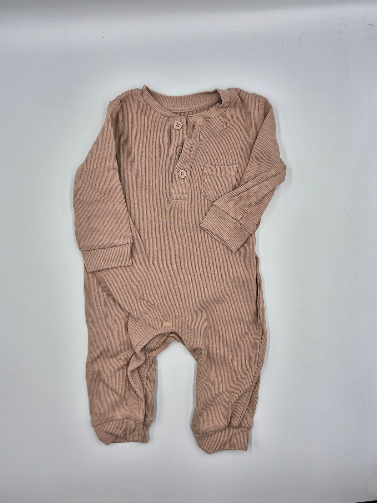 Overal má dlouhý rukáv i nohavice, takže je ideální do chladnějších dnů – na doma, do kočárku i na návštěvy. Žebrovaný materiál dodává kousku pružnost a pohodlí při pohybu. Na přední straně najdeš tři knoflíčky u krku a malou náprsní kapsičku, které mu dodávají jemný, lehce elegantní vzhled. Praktické patentky mezi nožičkami usnadňují přebalování.