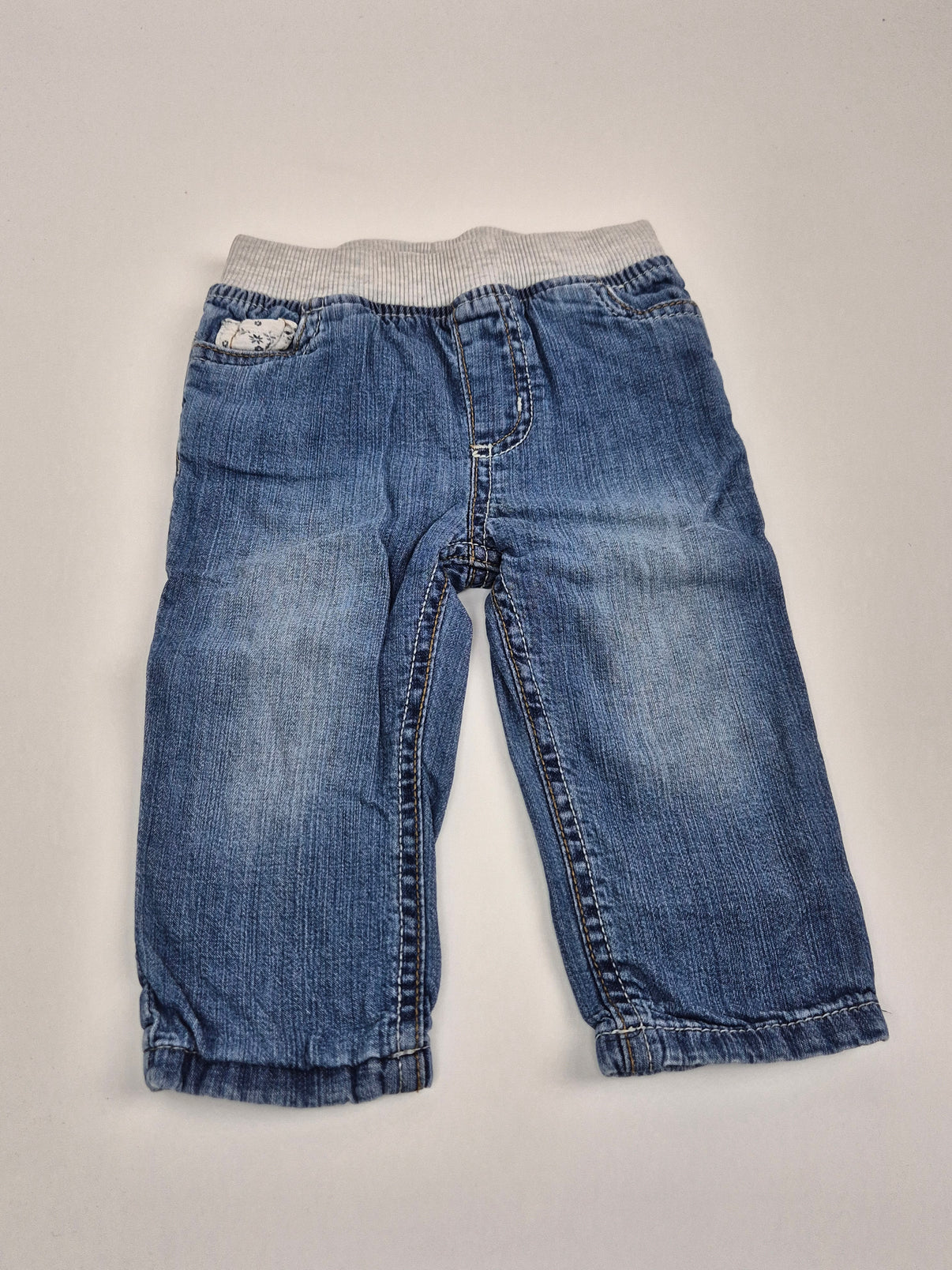 Praktické dětské džíny v klasickém středně modrém denimovém odstínu s jemným vyšisováním na nohavicích. Uvnitř jsou příjemně podšité, takže krásně zahřejí v chladnějším počasí. Pohodlný pružný pas bez zapínání zajistí snadné oblékání a komfort při nošení, aniž by tlačil na bříško. Rovný střih umožňuje volný pohyb při lezení i prvních krůčcích.