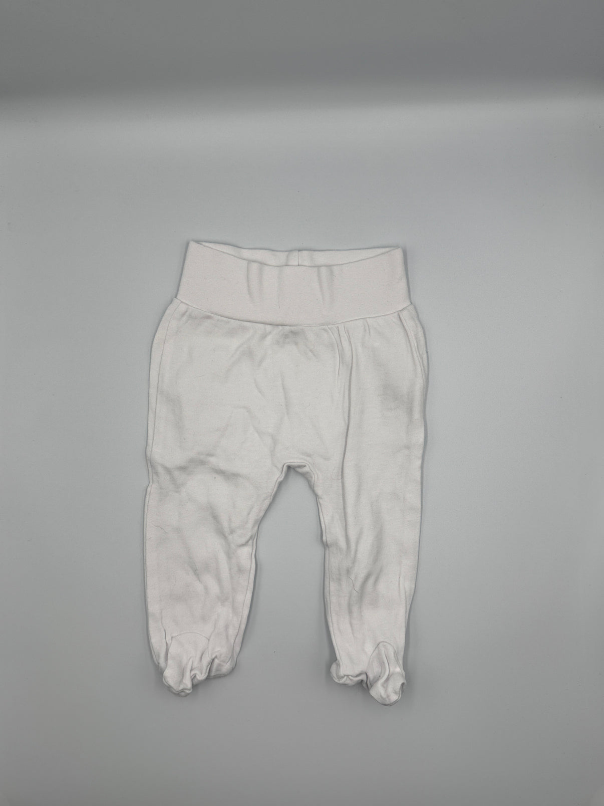 Jednoduché bílé polodupačky z měkkého bavlněného materiálu, ideální jako základ výbavičky pro miminko. Pohodlný široký pas nikde netlačí a dobře drží na bříšku, zakončení nohaviček s ťapkami zajistí teplo a komfort po celý den. Skvělé na doma, na spaní i jako spodní vrstva pod overálek.