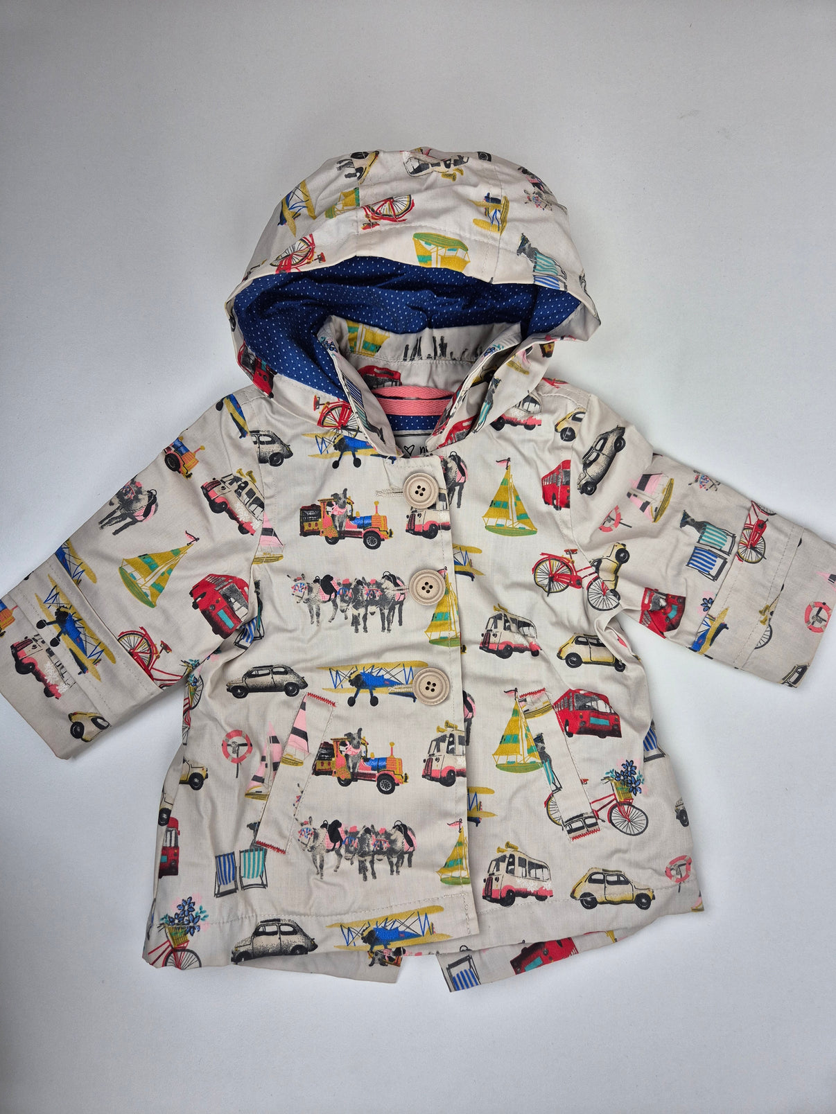 Světlý krémový podklad zdobí hravý celoplošný potisk s motivy autíček, londýnských autobusů, kol, plachetnic i zvířátek. Barevnost je jemná, ale zároveň veselá – kombinace červené, žluté, modré, růžové a černých detailů krásně vyniká na světlém základu. Vnitřní podšívka je tmavě modrá s drobnými bílými puntíky, což dodává kabátku stylový kontrast.