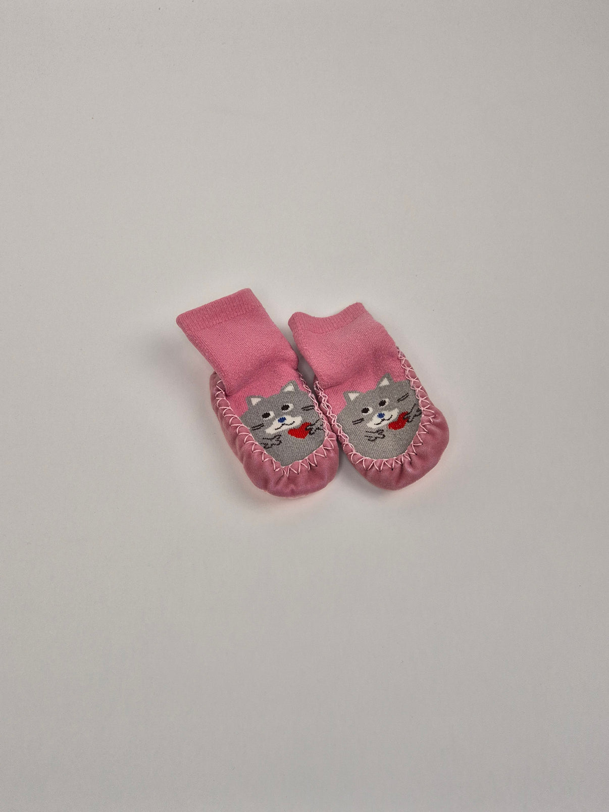 Měkké protiskluzové capáčky v růžových tónech s roztomilým motivem kočičky na špičce. Kombinace ponožkového vršku a jemné podrážky zajistí pohodlí i teplo pro malé nožičky. Spodní část je opatřena protiskluzovými puntíky, které pomáhají zabránit klouzání při prvních pokusech o stání a chození kolem nábytku. Pružný lem dobře drží, ale netlačí.