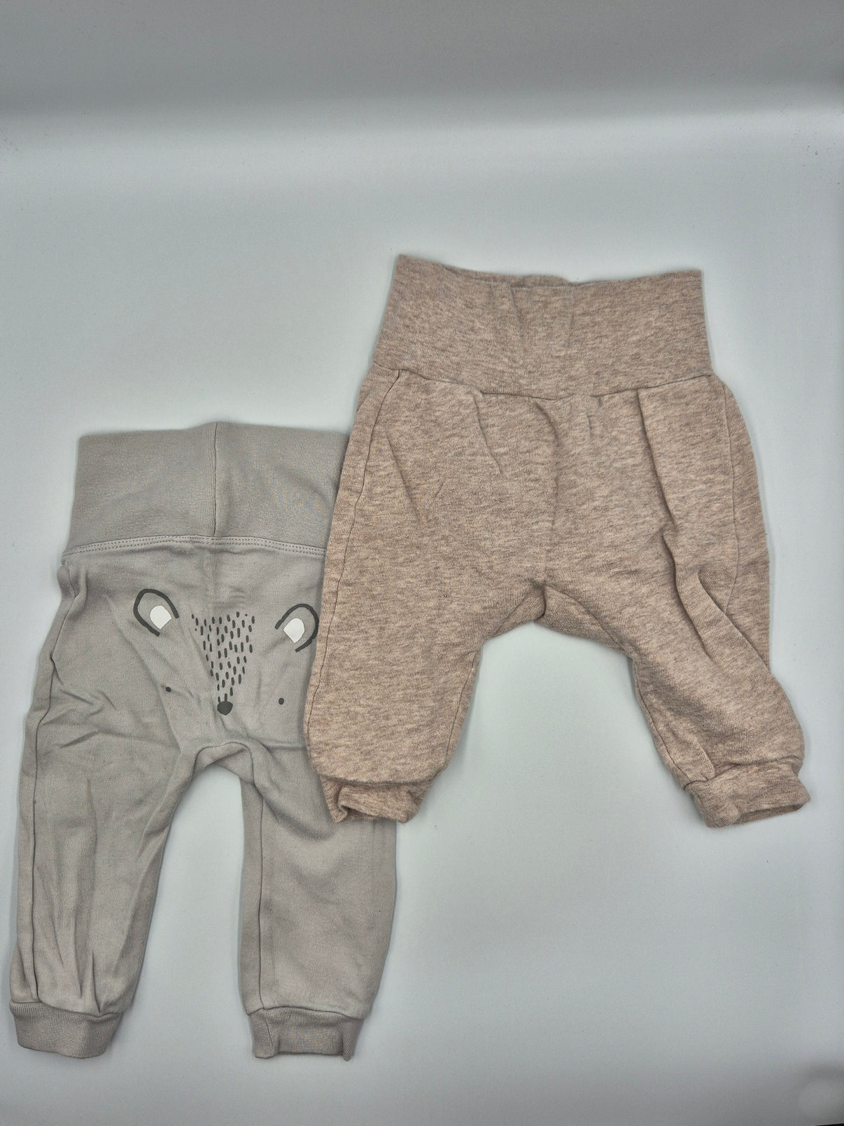 Jedny tepláčky jsou ve světle béžovo-šedém odstínu s roztomilým motivem medvídka na zadečku, který dodává celému outfitu hravý detail. Druhé jsou v teplém béžovém melíru, bez potisku, takže se snadno kombinují s jakýmkoliv body nebo mikinkou.