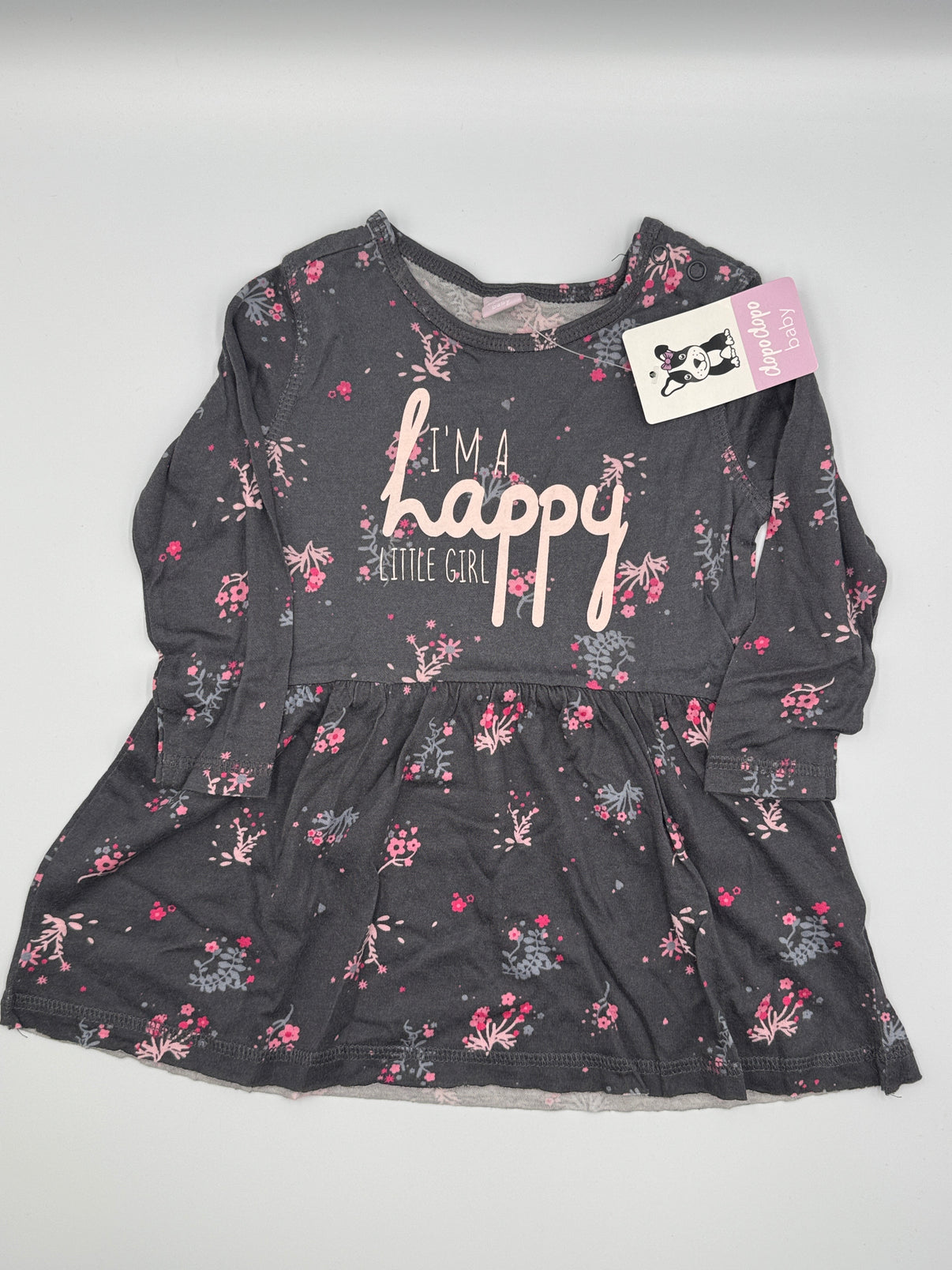 Základní barva je tmavě šedá až antracitová, která krásně kontrastuje s jemným květinovým potiskem v odstínech růžové, světle šedé a pudrové. Celkový dojem je něžný, ale zároveň praktický – tmavší podklad je ideální na běžné nošení. Na hrudi zaujme výrazný nápis “I’m a happy little girl” ve světle růžové barvě, který šatům dodává hravý a veselý charakter.