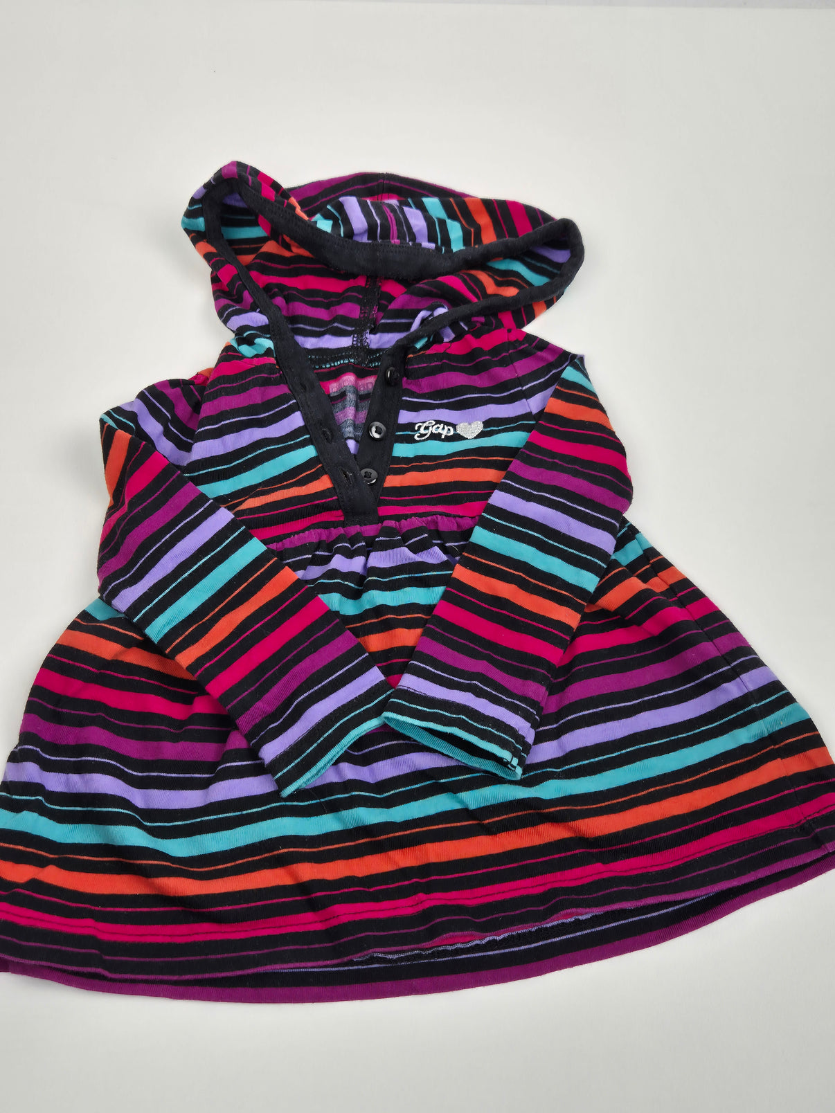 Stylové dívčí šaty GAP s kapucí v výrazném pruhovaném provedení. Kombinace černé, fialové, tyrkysové, růžové a oranžové barvy působí hravě a moderně. Měkký bavlněný materiál je příjemný na nošení a ideální pro každodenní pohodlí. Šaty mají dlouhý rukáv, lehce rozšířený střih a praktické zapínání u krku. Skvělá volba na běžné nošení, do kočárku i na procházky.