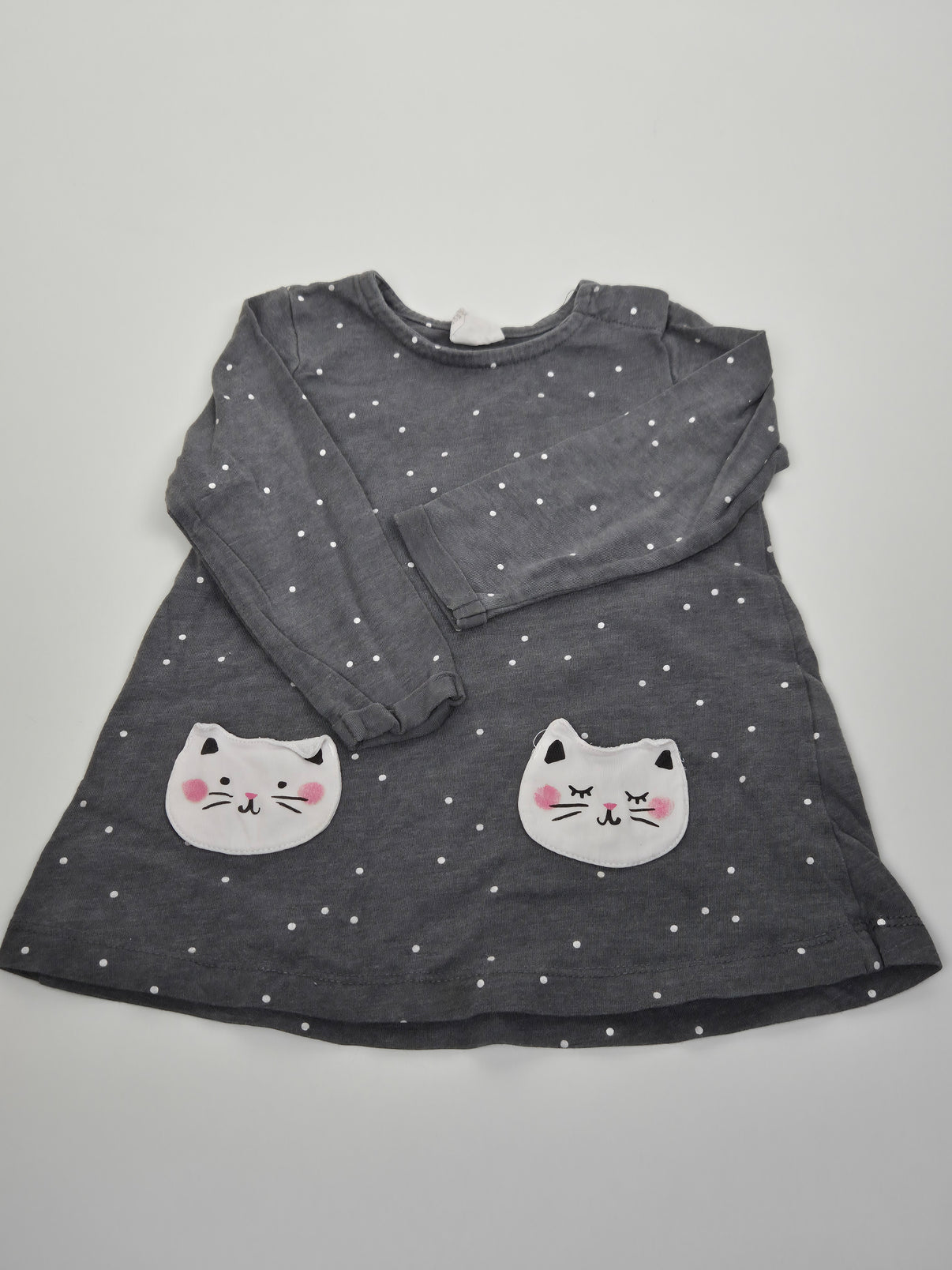 Pohodlné bavlněné šatičky s dlouhým rukávem v tmavě šedém melíru, doplněné drobnými bílými puntíky. Roztomilým detailem jsou dvě našité kapsičky s kočičími obličejíčky, které dodávají šatům hravý a něžný vzhled. Volnější střih je ideální na pohodlné nošení a dobře se kombinuje s legínami nebo punčocháči.