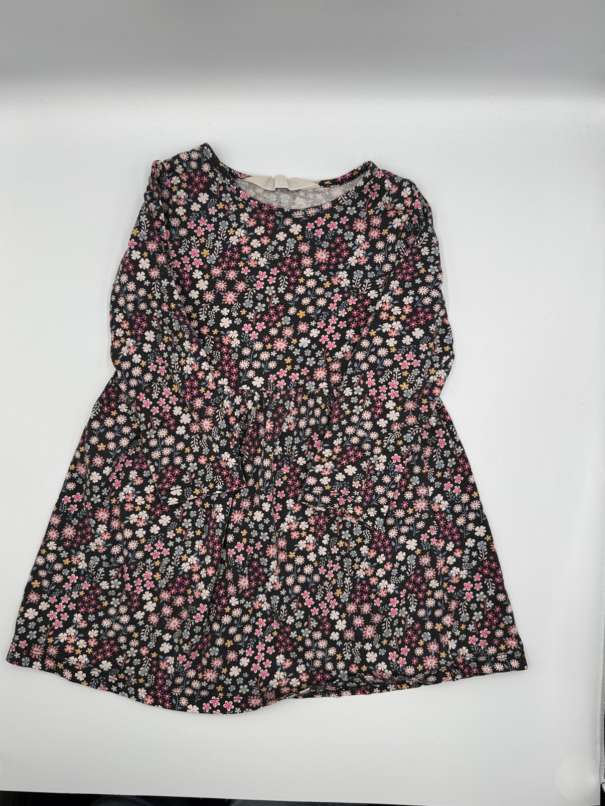 Krásné dívčí šaty značky H&M s bohatým květinovým vzorem na tmavém podkladu. Základ tvoří tmavě šedá až černošedá barva, která je hustě posetá drobnými kvítky v odstínech růžové, starorůžové, bílé a jemně meruňkové. Díky tomu působí šaty romanticky, ale zároveň prakticky – tmavší podklad je skvělý i na běžné nošení.