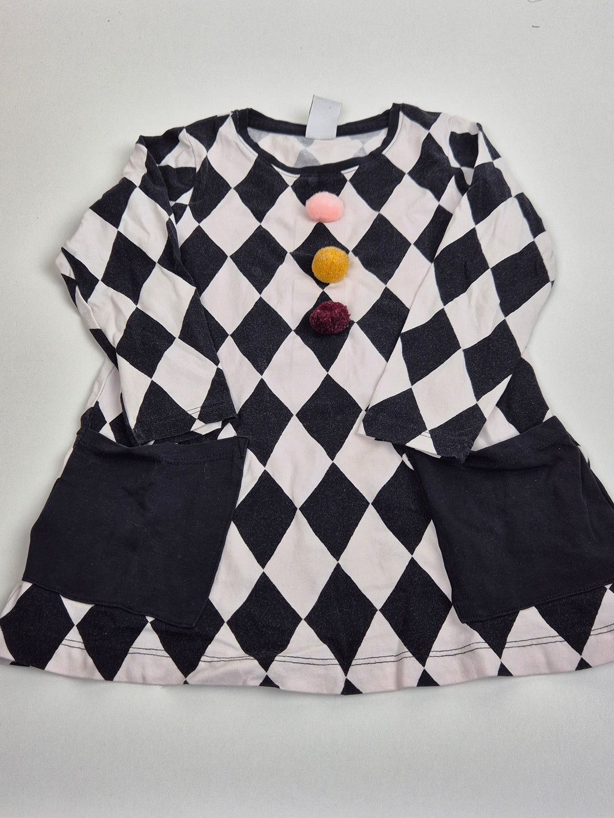 Originální a stylové šaty v kontrastní černo-bílé kombinaci s výrazným kosočtvercovým vzorem, který působí moderně a hravě zároveň. Střed předního dílu zdobí tři barevné bambulky v jemných odstínech růžové, hořčicové a vínové, které šatům dodávají veselý akcent. Praktickým detailem jsou také dvě přední kapsy v černé barvě.