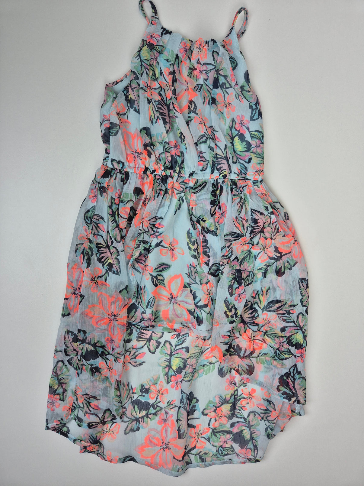 Lehoučké, vzdušné dívčí šaty Lindex ve velikosti 98 – ideální na léto i dovolenou. Mají jemný světle modrý podklad a výrazný květinový potisk v tónech neonové korálové, zelené, černé a růžové. Šaty mají tenká ramínka a volný splývavý střih, který se krásně nese a poskytuje maximální pohodlí v horkých dnech.