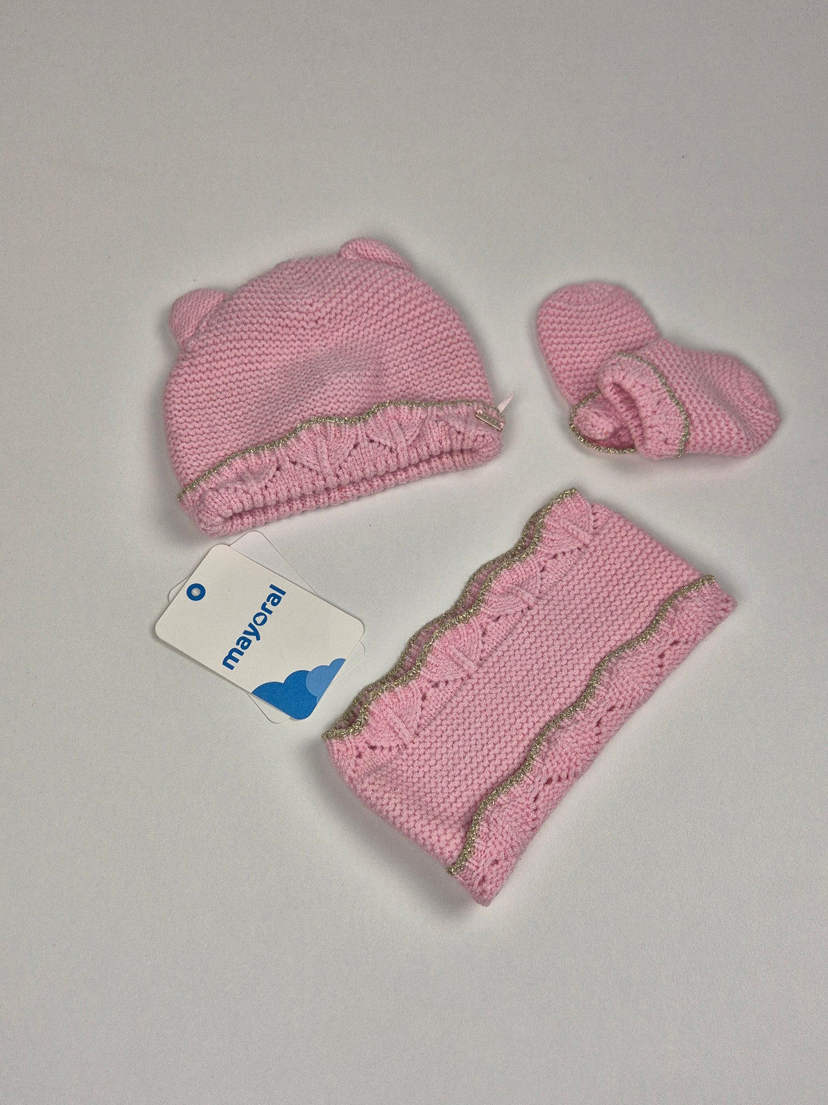 Krásný pletený set značky Mayoral, který rozzáří každý outfit malé holčičky. Jemná růžová barva, zlatavý lem a něžné detaily působí elegantně a sladce. Set obsahuje: Čepičku s oušky, která krásně...