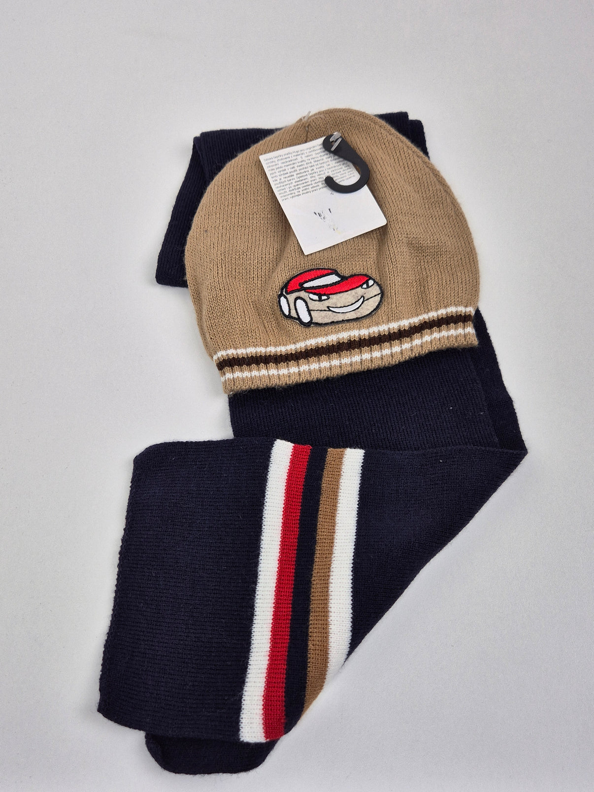 Dětský set čepice a šály Hugo v elegantním a nadčasovém provedení. Kombinace tmavě modré a teplé béžové barvy působí stylově a zároveň prakticky na každodenní nošení. Čepice je ozdobená veselou výšivkou autíčka, která dodává celému setu hravý dětský detail, zatímco pruhy na šále ladí s barvami čepice a vytváří hezky sladěný celek.