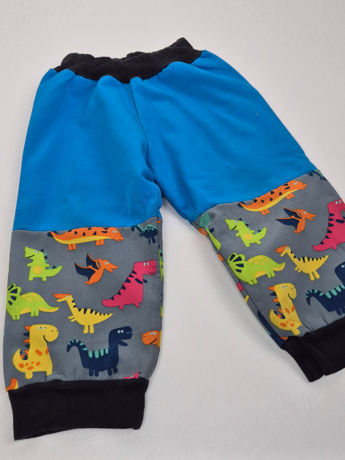 Praktické softshellové kalhoty v sytě modré barvě s hravým dinosauřím vzorem na kolenou a spodní části nohavic. Kombinace modré, šedé a pestrých barev působí veselým dojmem a zároveň je velmi praktická na venkovní nošení. Černé náplety v pase i na nohavicích dobře drží a brání profouknutí.