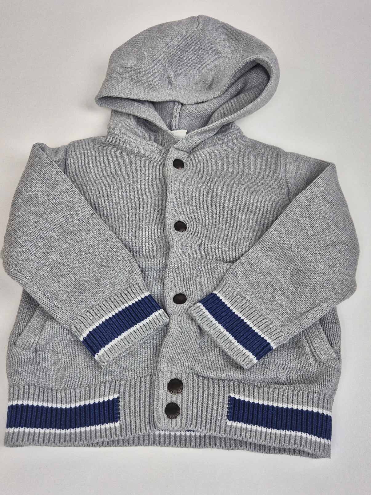 Kvalitní dětský svetr GAP v světle šedé barvě s modro-bílými pruhy na lemech a rukávech. Svetr je vyroben z příjemné, teplejší pleteniny, má kapuci a praktické zapínání na knoflíky. Skvěle se hodí jako svrchní vrstva na jaro či podzim – elegantní, ale zároveň pohodlný kousek do školky i na ven.