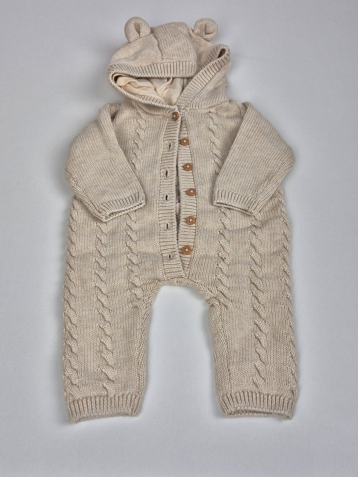 Pohodlný svetrový overal od značky C&A v jemném krémovém odstínu s copánkovým vzorem. Tento kousek je vyroben z měkké a hřejivé pleteniny, ideální pro chladnější dny. Zapínání na dřevěné knoflíky po celé délce usnadní oblékání a přebalování, zatímco kapuce s roztomilými oušky dodá overálku hravý vzhled.
