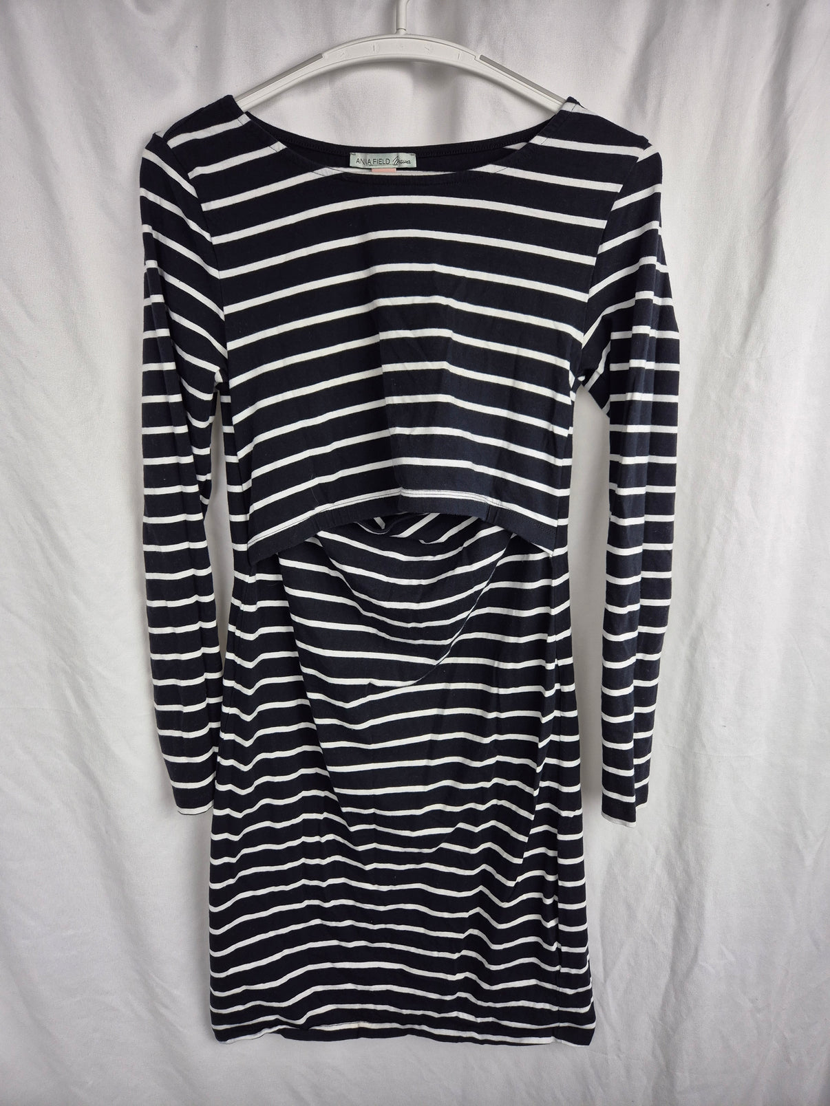 Pruhované těhotenské a kojící šaty Anna Field ve velikosti M v klasické kombinaci tmavě modré a bílé. Šaty mají příjemně pružný materiál, který se krásně přizpůsobí bříšku v každé fázi...