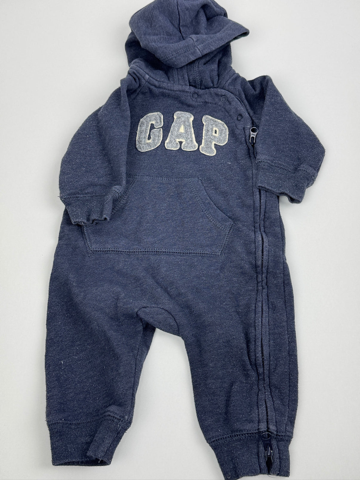 Pohodlný teplákový overal GAP ve velikosti 62/68 je ideální pro chladnější dny doma i venku. Tmavě modrá barva je praktická a unisex, doplněná výrazným logem GAP na hrudi v kontrastní výšivce. Overal má kapuci, klokaní kapsu a boční zip pro snadné oblékání, což ocení každý rodič. Měkký a hřejivý materiál zajistí miminku maximální pohodlí. Skvělý kousek pro holčičky i chlapečky na volný čas, procházky i cestování.