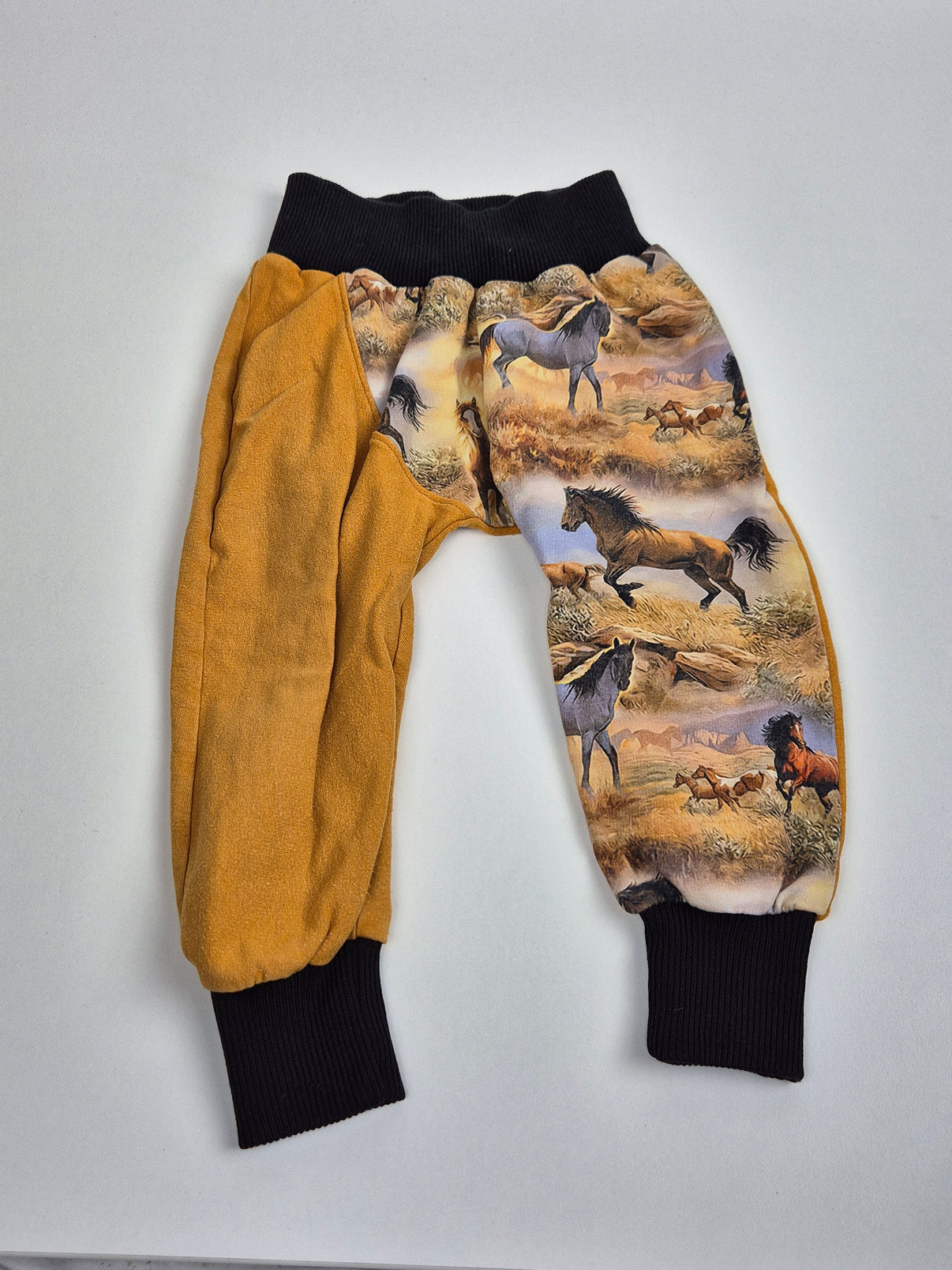 Tepláky z české malovýroby v teplém hořčicovém odstínu s výrazným celoplošným motivem divokých koní působí originálně a opravdu stylově. Kombinace jednobarevné části a potištěné látky dodává teplákům jedinečný vzhled. Měkký a hřejivý materiál je ideální do chladnějších dnů, na venkovní dobrodružství i pohodové nošení doma. Široké náplety v pase i na nohavicích dobře drží a zajistí pohodlí při pohybu. Krásný kousek, který potěší hlavně malé milovníky zvířat – vhodné spíše pro kluka, ale klidně i pro holčičku.