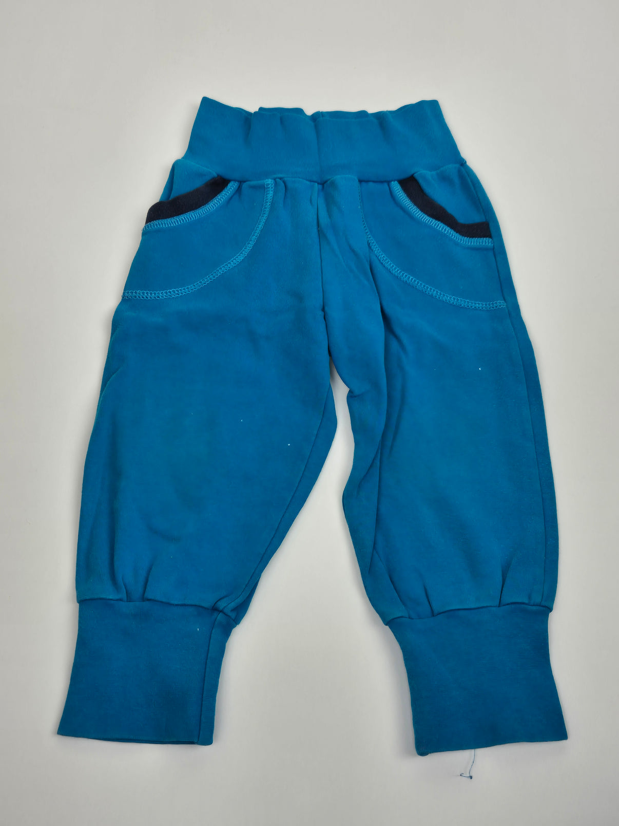 Pohodlné tepláky v sytém petrolejově modrém odstínu, které zaujmou jednoduchým, ale promyšleným zpracováním. Měkký a příjemný materiál je ideální na každodenní nošení – doma, do školky i na ven. Vysoký pružný pas bez zapínání krásně drží a netlačí na bříško, nohavice jsou zakončené dlouhými náplety, takže tepláky vydrží déle i při růstu. Praktické kapsy s tmavým detailem dodávají sportovní vzhled.