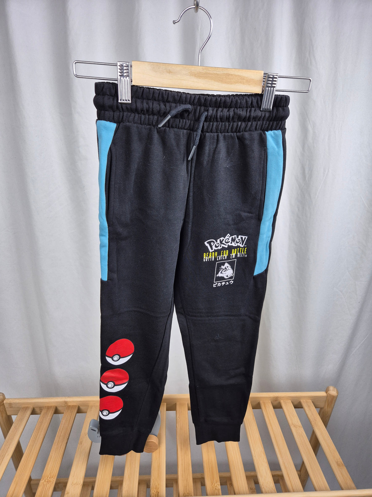 Černé tepláky s modrými pruhy po stranách, potiskem Pokéballů na nohavici a logem Pokémon s Pikachu motivem na stehně.