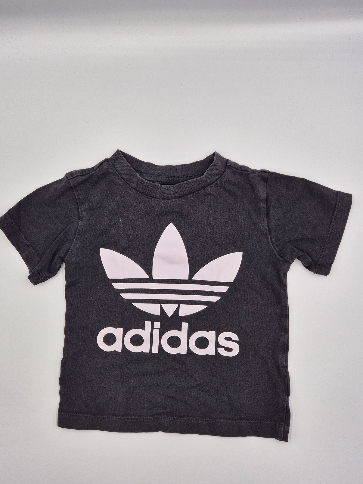 Tričko je v tmavě šedém až antracitovém odstínu s lehce vyšisovaným efektem, který mu dodává moderní, sportovní vzhled. Výrazné bílé logo Adidas s ikonickým trojlístkem na hrudi krásně kontrastuje s tmavým podkladem a dodává kousku nadčasový streetový styl.