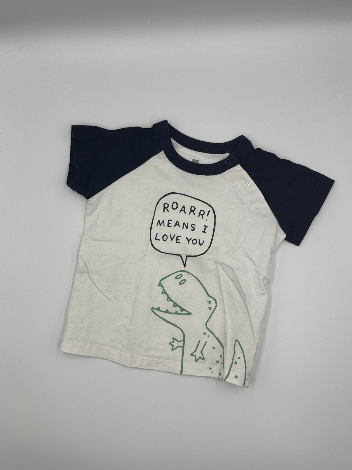 Tričko je v kombinaci krémově bílé a tmavě modré. Tělo trička má jemný smetanový odstín, rukávy a lem kolem krku jsou v syté námořnické modré, což vytváří hezký kontrast a sportovní vzhled. Na přední straně je zelený dinosaurus s bublinou „ROARR! MEANS I LOVE YOU“, která dodává kousku vtipný a roztomilý nádech.