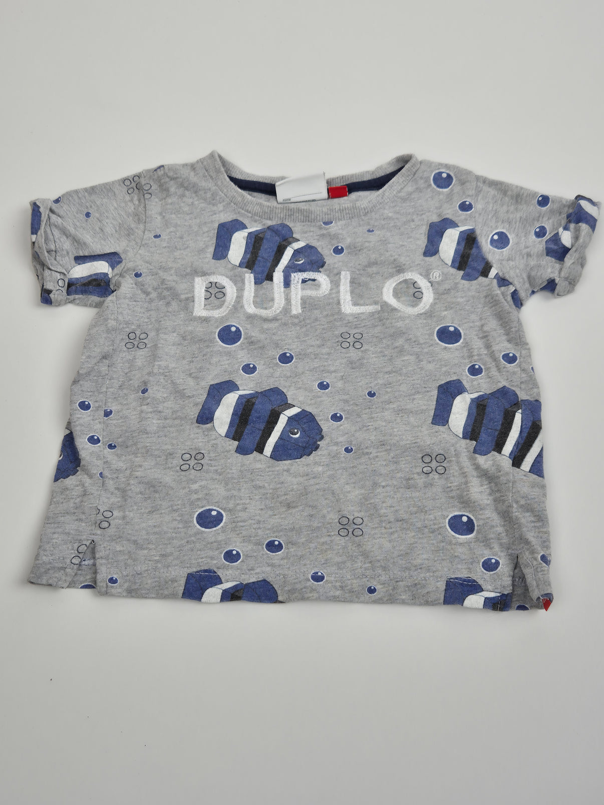 Šedé melírované tričko s hravým potiskem modrých rybiček a bublin zaujme na první pohled. Jemná kombinace světle šedé, námořnické modré a bílých detailů působí svěže a nadčasově. Na přední straně je plastický nápis DUPLO, který potvrzuje originální kousek od značky LEGO.